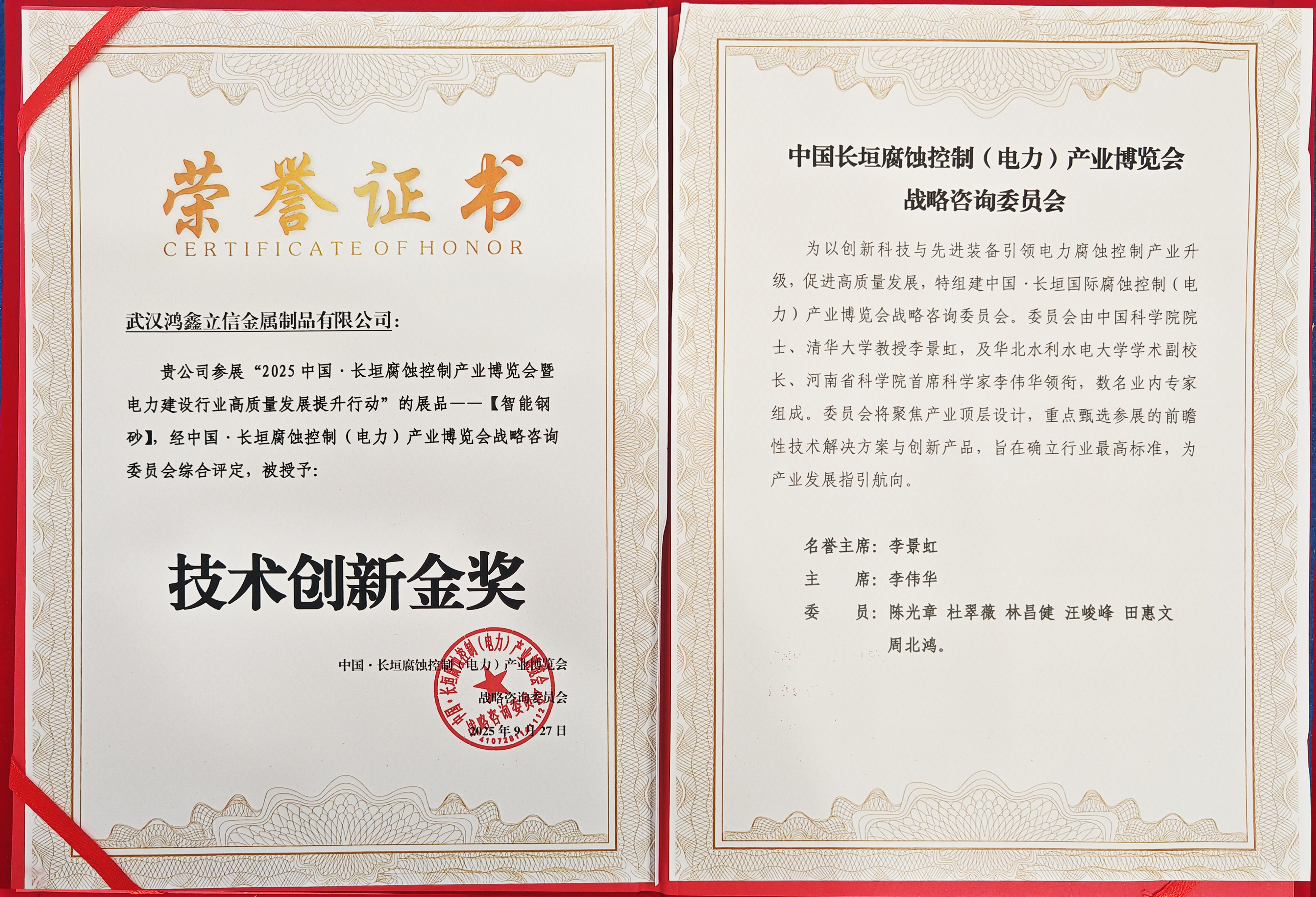 2025年9月26日,中國(guó)·長(zhǎng)垣腐蝕控制(電力)產(chǎn)業(yè)博覽會(huì)戰(zhàn)略咨詢(xún)委員會(huì)會(huì)議在“中國(guó)防腐蝕之都"河南長(zhǎng)垣隆重召開(kāi)。鴻鑫立信金屬制品有限公司董事長(zhǎng)陳群芝女士親自率領(lǐng)公司技術(shù)團(tuán)隊(duì)受邀出席此次行業(yè)高端論壇。會(huì)議期間,公司自主研發(fā)的“智能鋼砂"產(chǎn)品,憑借其在提升電力設(shè)施防腐效能方面的突破性創(chuàng)新,榮獲大會(huì)頒發(fā)的“技術(shù)創(chuàng)新獎(jiǎng)"。我國(guó)腐蝕控制領(lǐng)域權(quán)威專(zhuān)家陳光章老師作為委員會(huì)核心成員出席會(huì)議并對(duì)獲獎(jiǎng)的創(chuàng)新技術(shù)表示高度認(rèn)可。